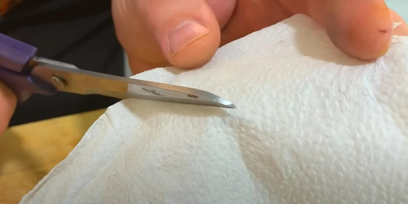 Для этого метода вам понадобится наждачная бумага с самым мелким зерном (часто её называют «нулёвкой»). Просто нарежьте её на узкие полоски. Достаточно сделать 10–12 разрезов, чтобы лезвия ножниц снова стали острыми, как бритва. Этот способ гораздо эффективнее старого метода с иголкой и не требует порчи дорогостоящей пищевой фольги.