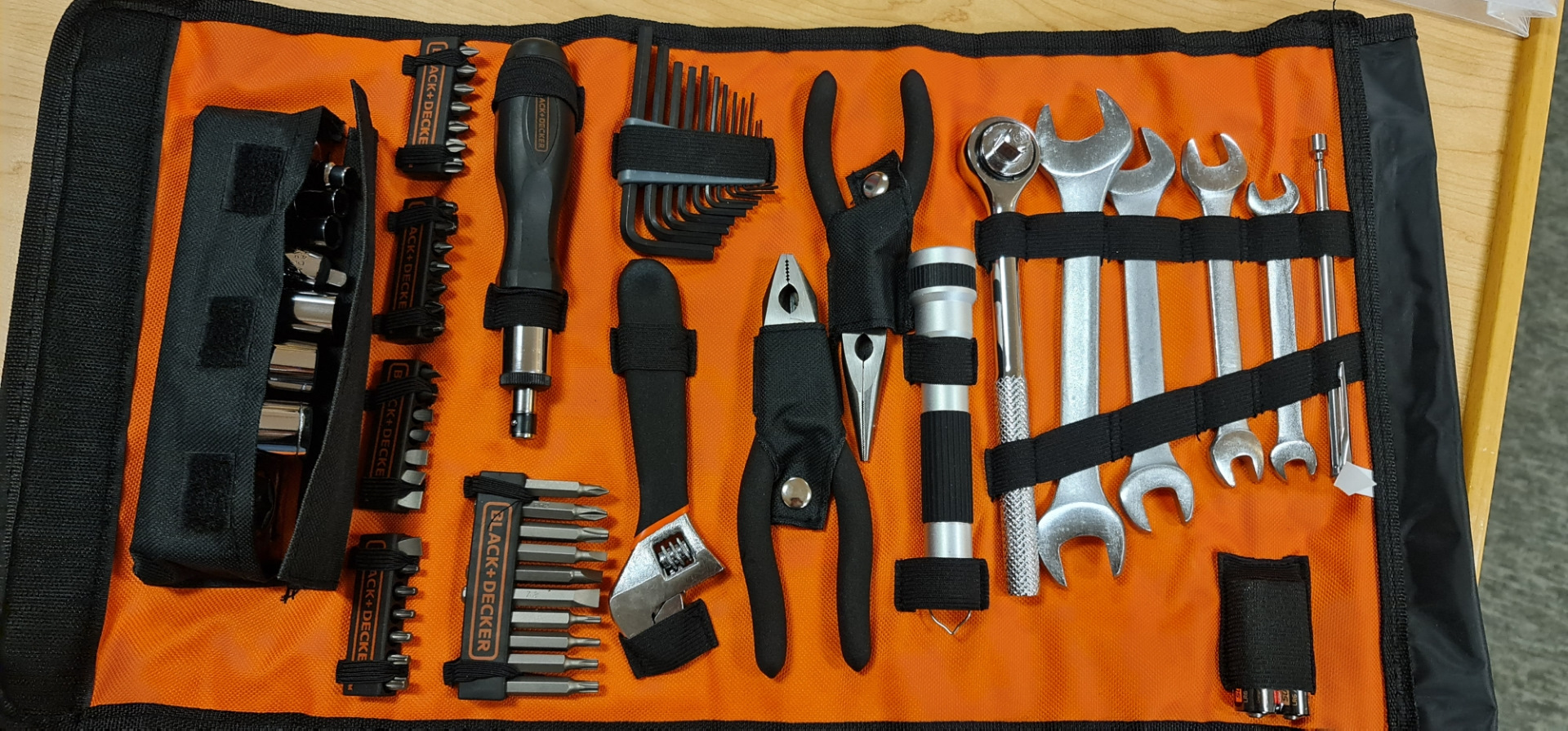 Это ваш повседневный арсенал. Выбор огромен, главное — чтобы в комплекте были самые необходимые предметы. В моём наборе были: молоток с гвоздодёром, пассатижи, рулетка (минимум на 3 метра), отвёртка со сменными битами, ножовка по металлу, набор шестигранников (мультитул), гаечные ключи и строительный нож. Отдельно пришлось докупить стамеску и пилу по дереву, так как они часто требуются при работе с древесиной.