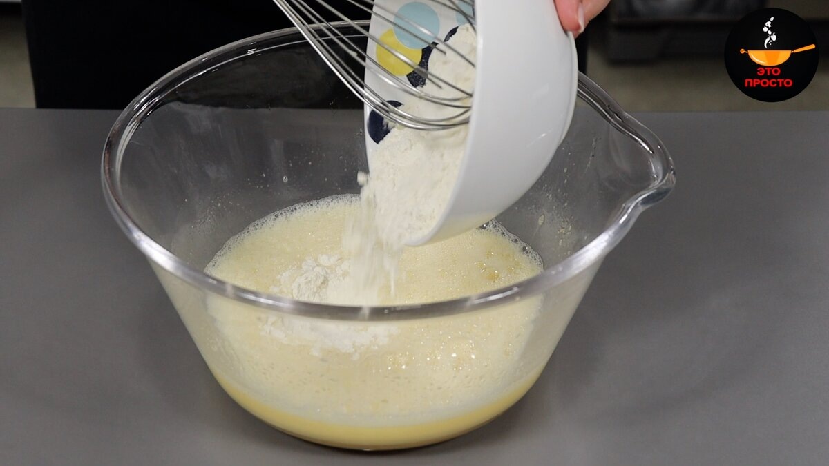 2. Введение муки. Муку обязательно просейте для насыщения кислородом и предотвращения комков. Постепенно вводите её в жидкую основу, активно перемешивая венчиком до состояния однородного, гладкого теста консистенции жидкой сметаны.