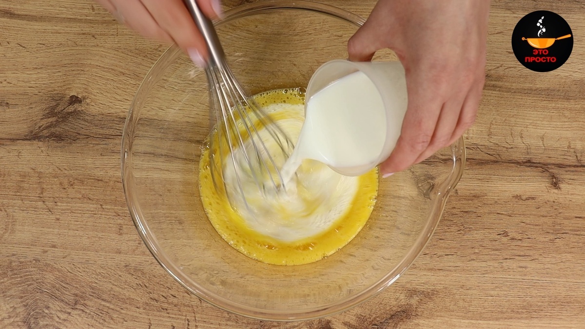 В глубокой ёмкости соедините яйца, сахар, соль и ванилин. Легко взбейте смесь венчиком до однородности, затем влейте молоко.