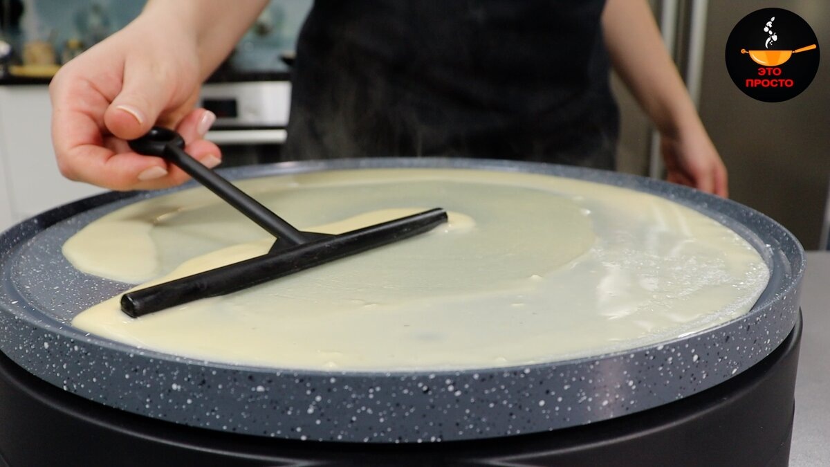 - Выливайте тесто на центр сковороды и быстрым круговым движением распределяйте по поверхности.