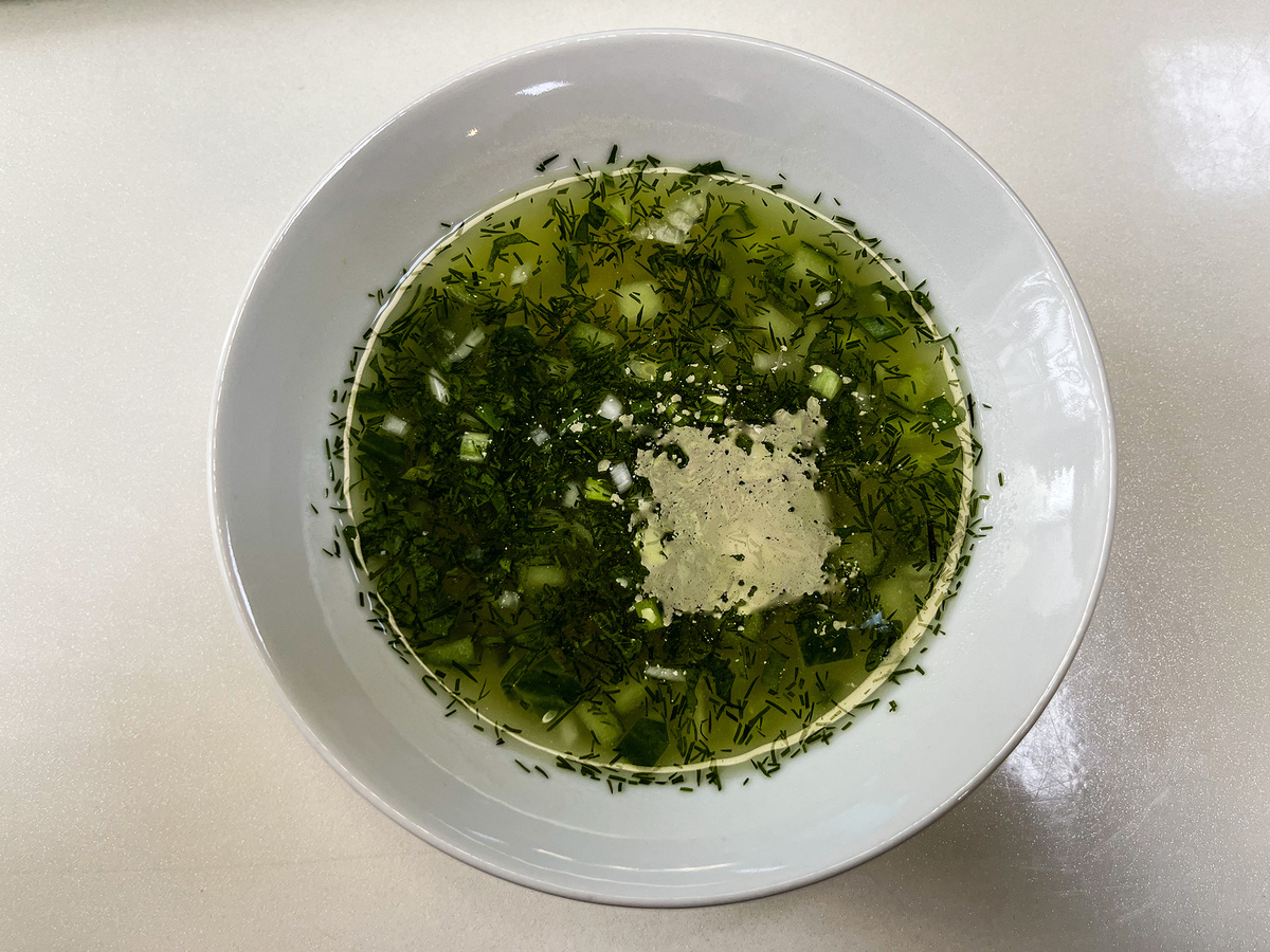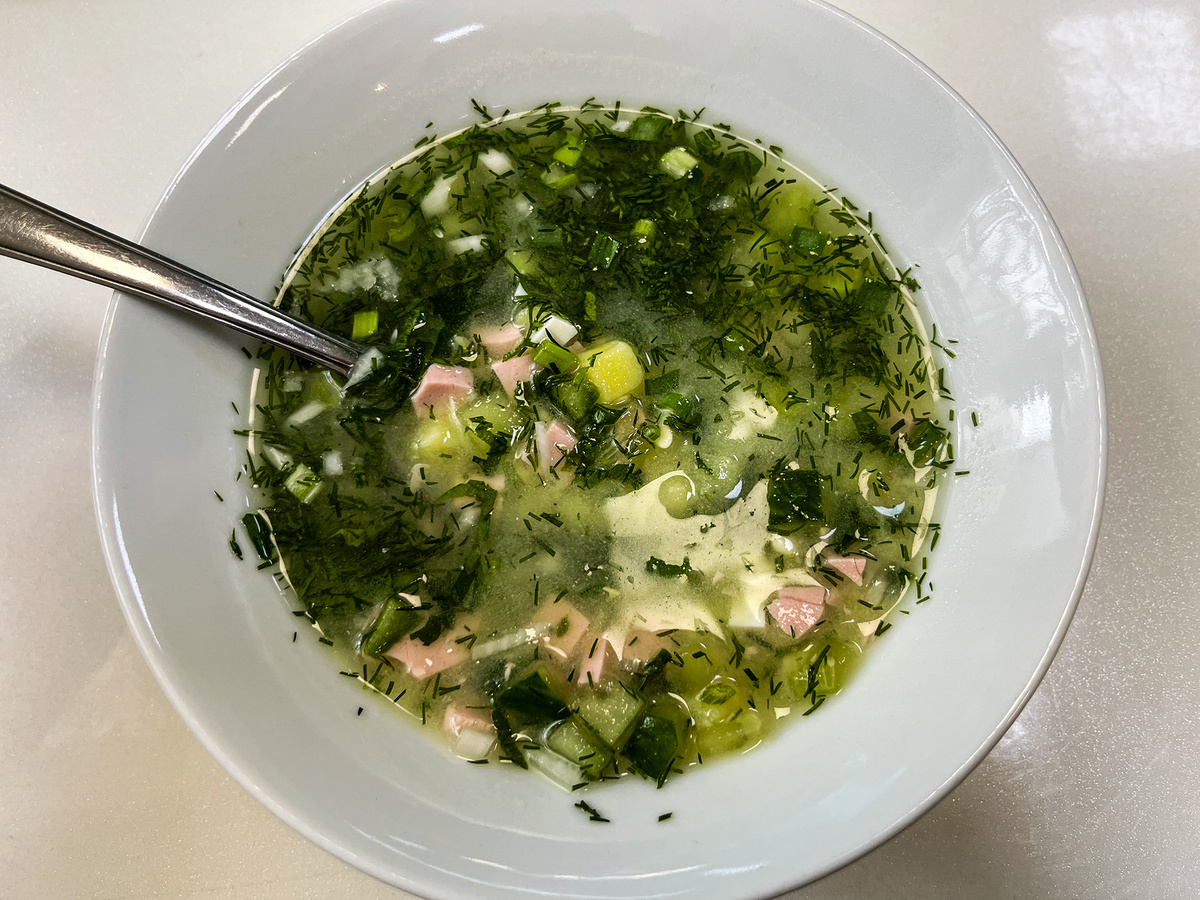 Этот суп можно было бы назвать «укропным отваром» — настолько доминировала зелень, полностью перекрывая вкус картофеля, яиц, колбасы и даже самого уксуса. Консистенция была водянистой, а отсутствие насыщенности не исправила бы даже дополнительная порция сметаны. Оценка: 2 из 5.