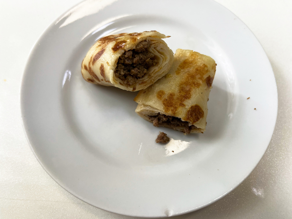Блины были толстыми, излишне жирными и обладали странным «холодильным» привкусом, как у продукта, размороженного с нарушением технологии. Фарш внутри оказался сухим, жестким и практически безвкусным, что указывало на разогрев в микроволновой печи, а не на свежее приготовление. Оценка: 2 из 5.