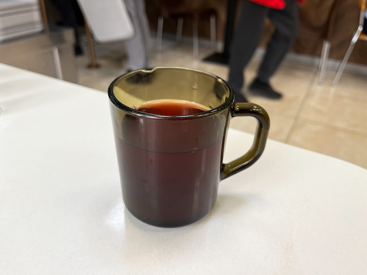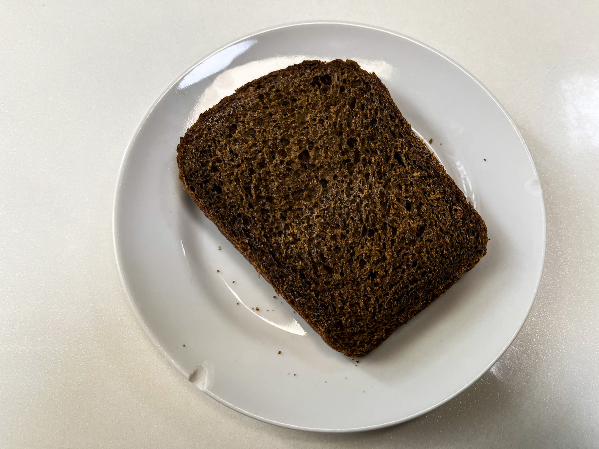 Черный хлеб, вероятно, был покупным, но хотя бы не банальным «Бородинским». Его минусом стала не первой свежести консистенция. Напиток брусничный, который наливают самостоятельно из графина, оказался легким, слегка сладковатым морсом без выраженного вкуса ягод. Отдельно стоит отметить состояние посуды: из шести предметов на трех были сколы. Оценка каждому: 3 из 5.
