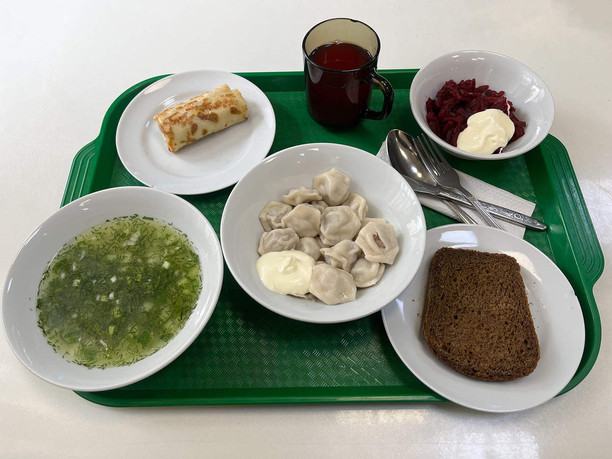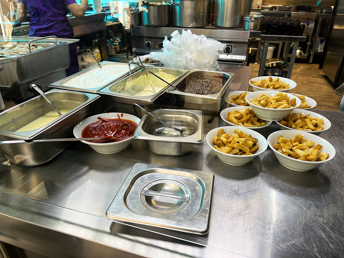 Формат обслуживания — гибрид столовой и раздаточной. Сначала нужно заказать и оплатить у кассира, получить рукописный чек, а затем предъявить его на раздаче. Персонал работает быстро, но без эмоций: тарелки буквально летят на поднос, а о дружелюбии можно только мечтать. Еда подается из открытых емкостей: пельмени вылавливают из большого металлического корыта, салаты достают из холодильника, а соусы наливают из плошек без крышек, что вызывает вопросы к соблюдению санитарно-гигиенических норм, в частности, правил товарного соседства и защиты от внешней среды.